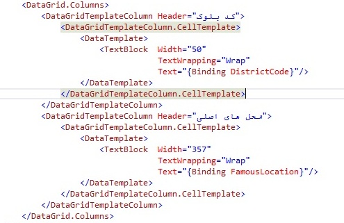 در قطعه کد بالا در قسمت Header باید عنوانی که در هنگام ساخت DataGrid برای ستون مورد نظر انتخاب کردید بنویسید. Width عرض ستون را مشخص میکند و DistrictCode و FamousLocation که در قسمت Textنوشته شده اند نام ستون های مورد نظر در اکسل هستند که ستون های DataGrid ما از آنجا انتخاب می شوند.